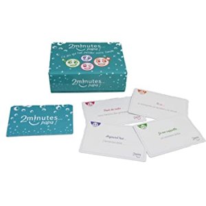 2 minutes papa ! c’est prendre le temps de rire ensemble 2 minutes papa ! c’est se connaître différemment en créant un vent de transparence dans les relations père/enfant 2 minutes papa ! C’est développer l’imaginaire de son enfant et retrouver pour papa son âme d’enfant ! 2 minutes papa ! C’est créer des micros-moments de bonheur en résumé, 2 minutes papa ! c’est favoriser les échanges et la communication de manière ludique La règle du jeu : enfantine ! Le plus jeune commence, chacun tour à tour pioche une carte au hasard et y répond en max 2 minutes
