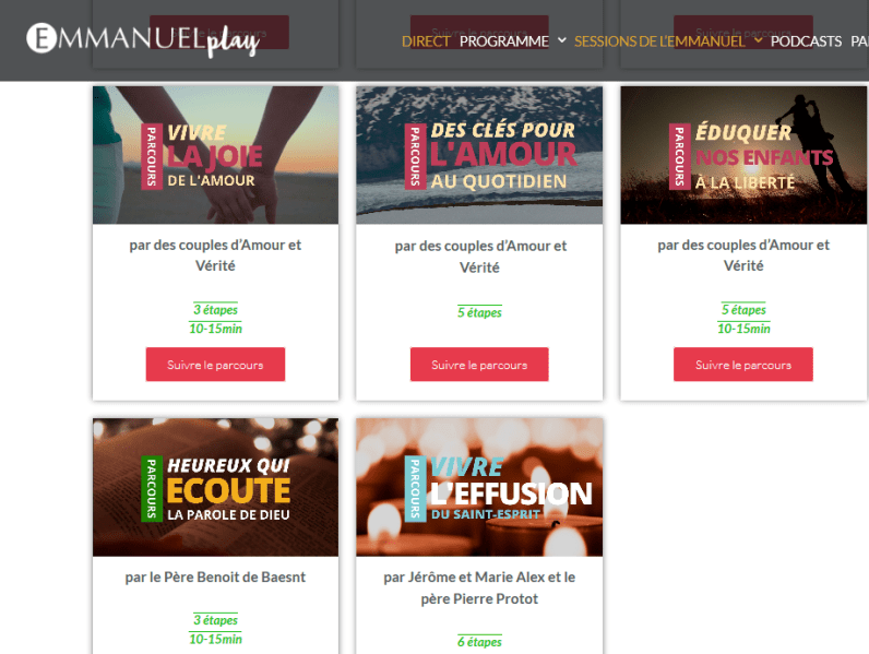Suivez le ou les parcours de votre choix parmi les parcours 17 proposés cet été. Des parcours sont spécialement dédiés aux couples comme Vivre la joie de l’amour, les clés pour l’amour au quotidien et éduquer nos enfants à la liberté.