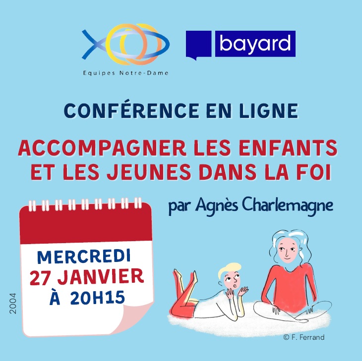 En collaboration avec Bayard, les Equipes Notre-Dame vous invitent à une conférence en ligne sur le thème « Accompagner les enfants et les jeunes dans la Foi » par Agnès Charlemagne, le mercredi 27 janvier à 20h15.
