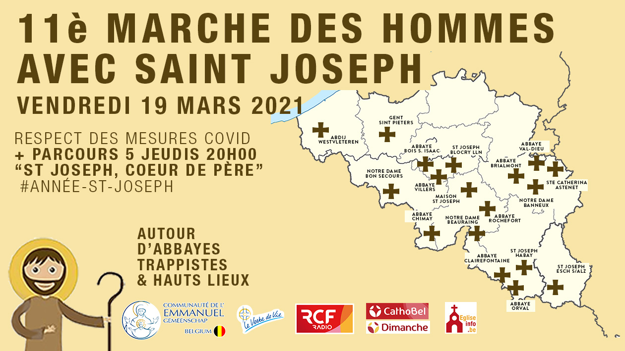 - Rendez-vous le vendredi 19 mars 2021 dès 8h30 autour de plus de 15 abbayes et hauts lieux dédiés à saint Joseph pour une rando d’environ 15 km.