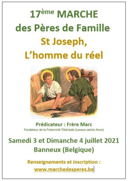 Pour l’édition 2021, le prédicateur sera le frère Marc de la Fraternité de Tibériade. Il est très attaché à Saint Joseph et le thème de son enseignement sera : « Saint Joseph, l’homme du réel« . Frère Marc montrera en quoi l’exemple de St Joseph nous permet d’avancer dans notre mission d’époux, de père, d’éducateur, garant de la transmission de valeurs qui nous sont chères, attaché aux choses simples et pleines de bon sens, tourné vers la recherche du bonheur de notre épouse et de nos enfants. Son enseignement est le fruit d’années de réflexion et s’adressera à chacun de nous, quel que soit notre chemin de vie.