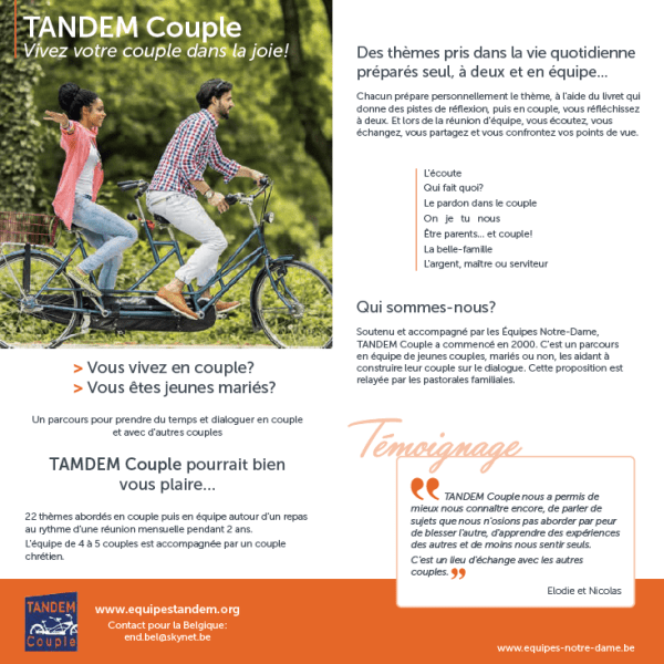 Le projet TANDEM propose d’aider des jeunes couples (mariés ou non) qui veulent consolider leur couple via un parcours de 2 ans à raison d’une réunion toutes les 4 à 6 semaines. Les réunions se font en équipe de 4 à 5 couples (toujours les mêmes durant le parcours) avec un couple animateur.