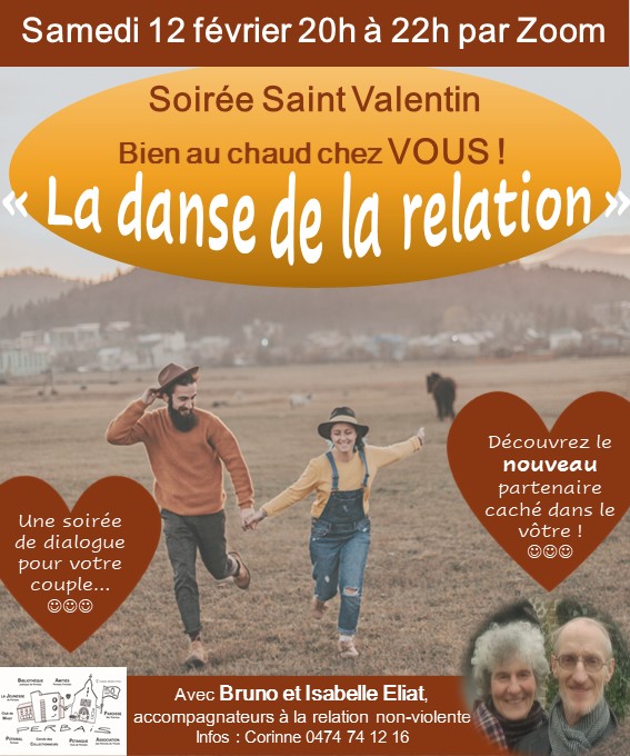 Une soirée pour votre couple « bien au chaud chez vous », par Zoom, pour apprendre une nouvelle façon de communiquer. Venez découvrir le NOUVEAU PARTENAIRE caché dans le vôtre et entrer dans la Danse de la Relation à 4 pas.