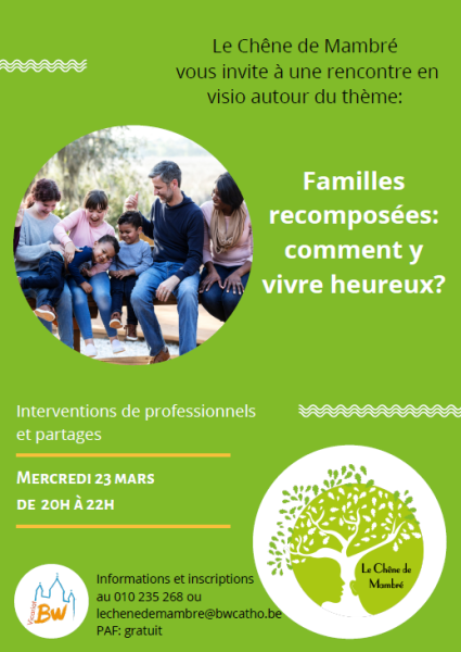 Le Chêne de Mambré vous invite le mercredi 23 mars à 20h a vivre une rencontre en visio (Zoom) autour du thème Familles recomposées : comment y vivre heureux ?. A la suite d’un court exposé reprenant les caractéristiques et les enjeux du défi abordé par des professionnels, des échanges seront proposés aux participants pour leur permettre de déposer leur vécu, de partager leur expérience et d’apprendre comment les autres vivent ce changement.