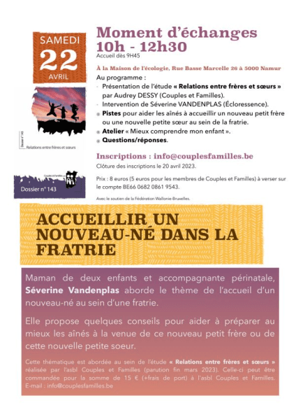 - Inscriptions : info@couplesfamilles.be ; Clôture des inscriptions le 20 avril 2023