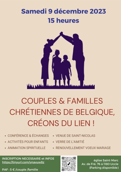 – conférence/table ronde d’intervenants issus du monde de pastorales familiales et porteurs de projets à destination des couples. Ils répondront à la question : « Comment se faire aider en tant que couple et famille chrétienne en Belgique ? » ;