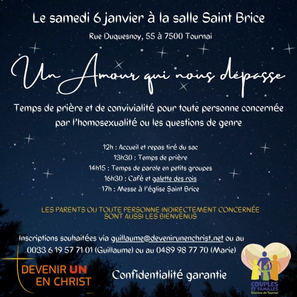 Cet événement convient aux personnes de toute conviction, ouvertes à l’Église catholique. Il est organisé par l’association Devenir Un En Christ et la pastorale des Couples et Familles du diocèse de Tournai.