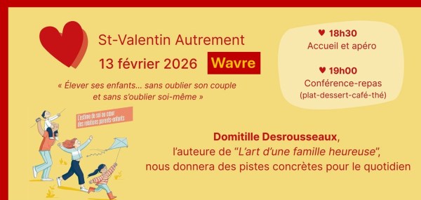 Poser un regard nouveau sur notre rôle de parent... en couple. Placer l’estime de soi au cœur des relations familiales, devenir des adultes plus alignés et plus sereins pour nos enfants. Domitille Desrousseaux viendra nous donner des pistes concrètes pour notre vie de couple et de famille.